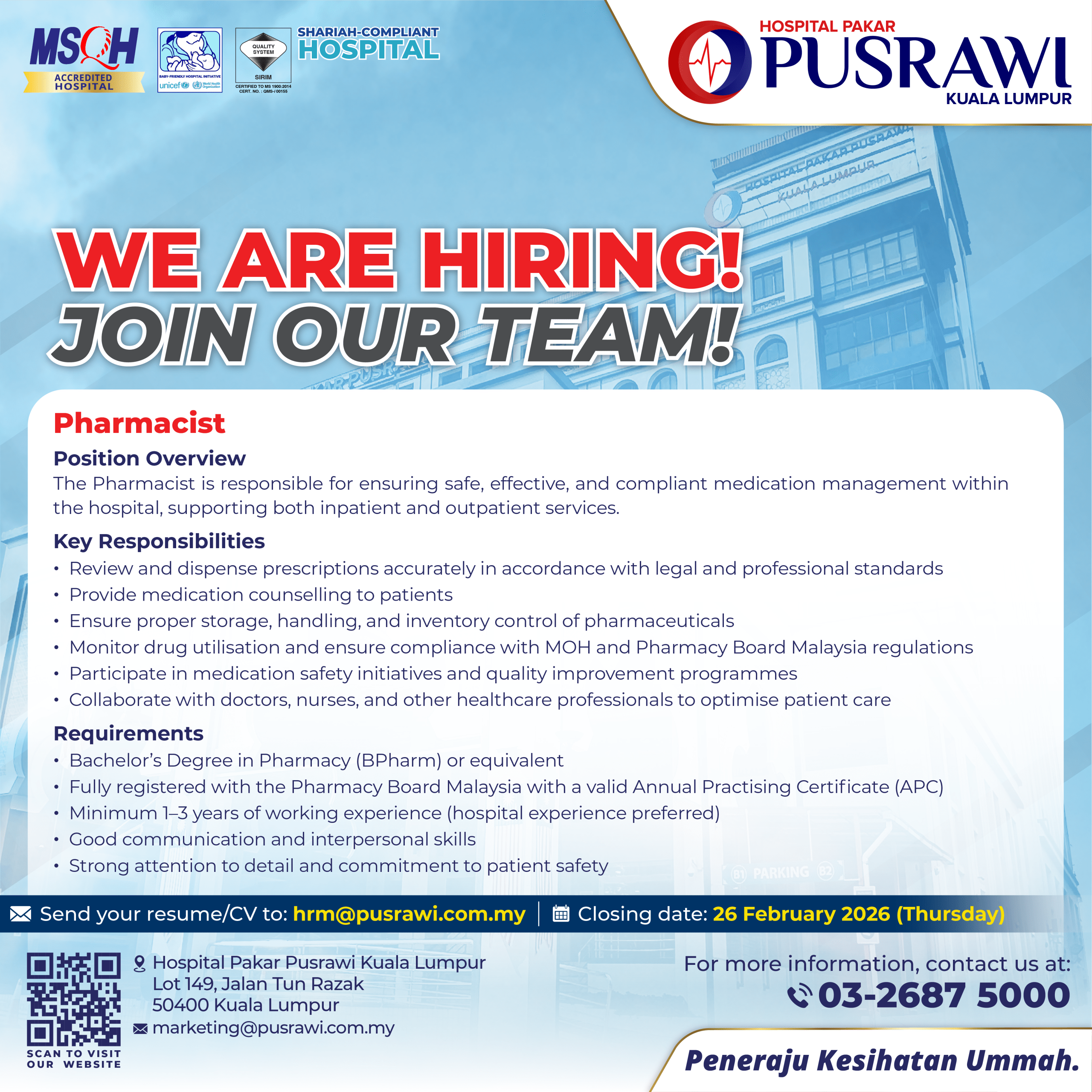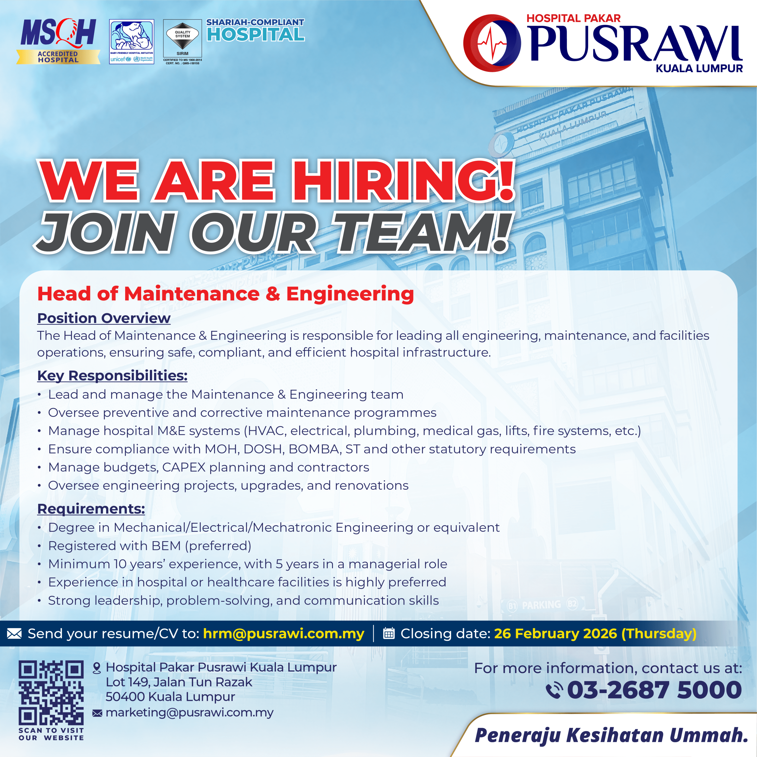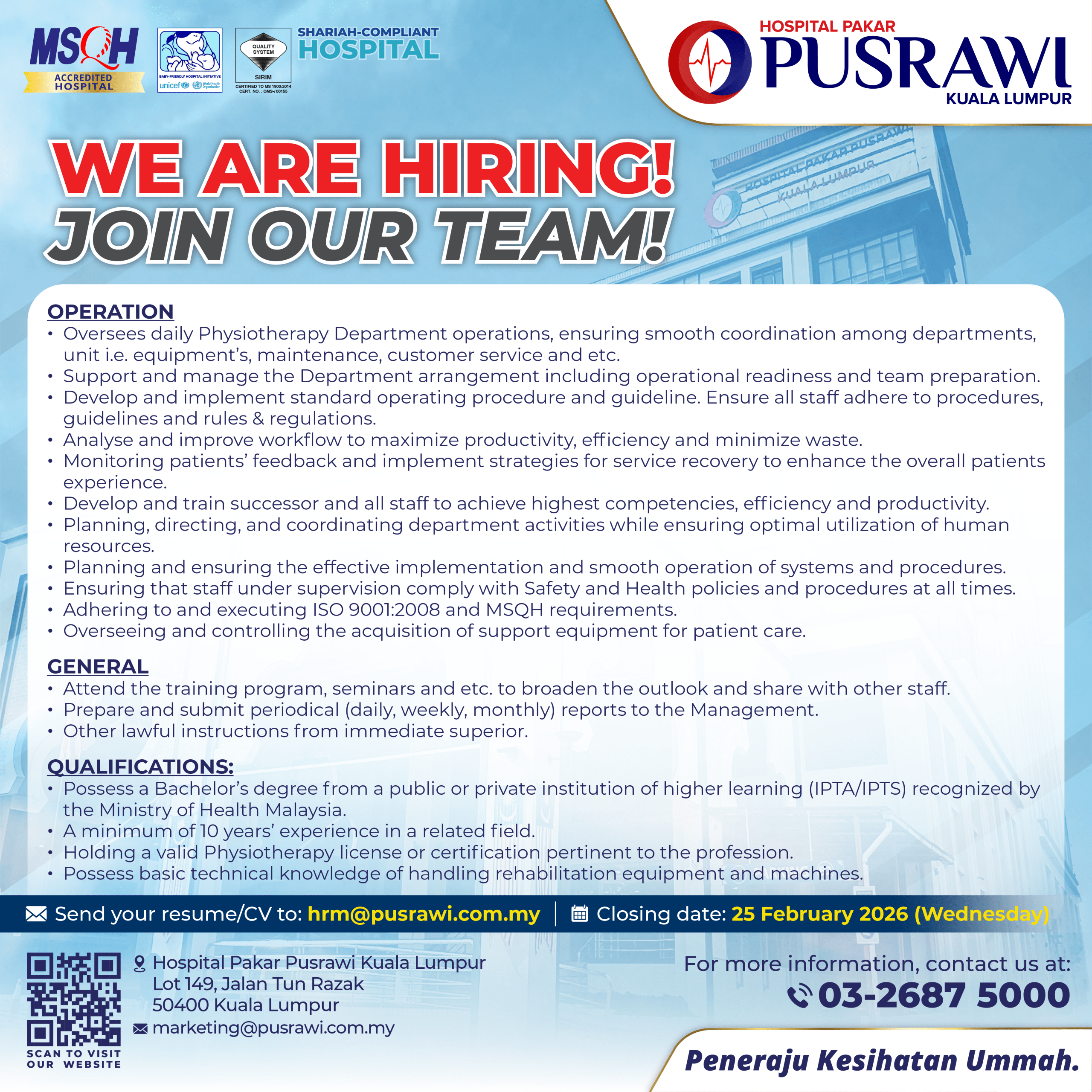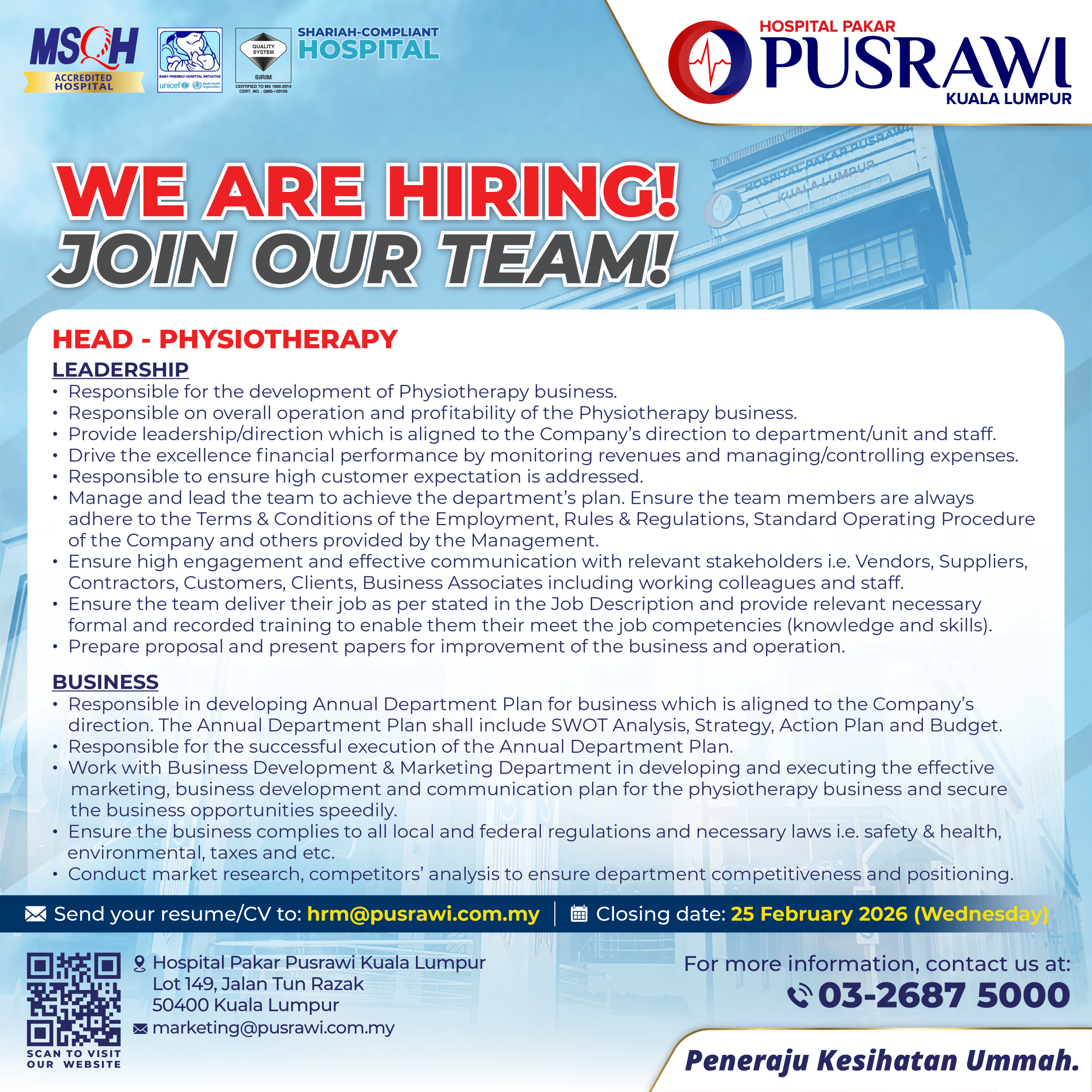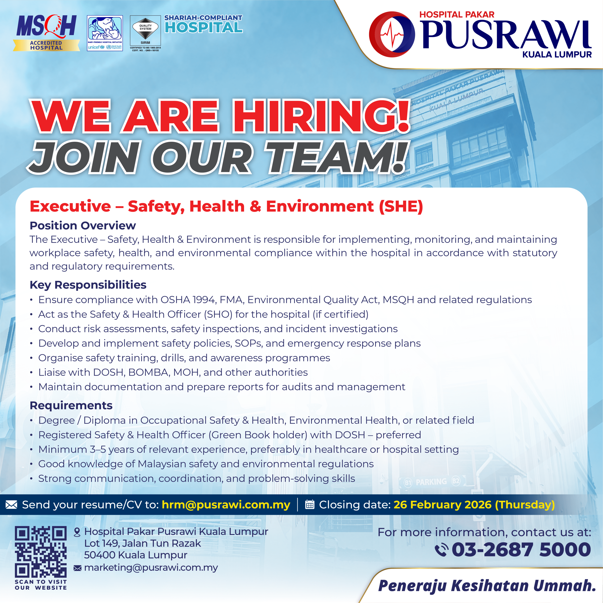 Career HEAD OF PHYSIOTHERAPY HEAD OF MAINTENANCE & ENGINEERING EXECUTIVE – SAFETY, HEALTH & ENVIRONMENT (SHE) PHARMACIST HUMAN RESOURCE EXECUTIVE SPEECH THERAPIST